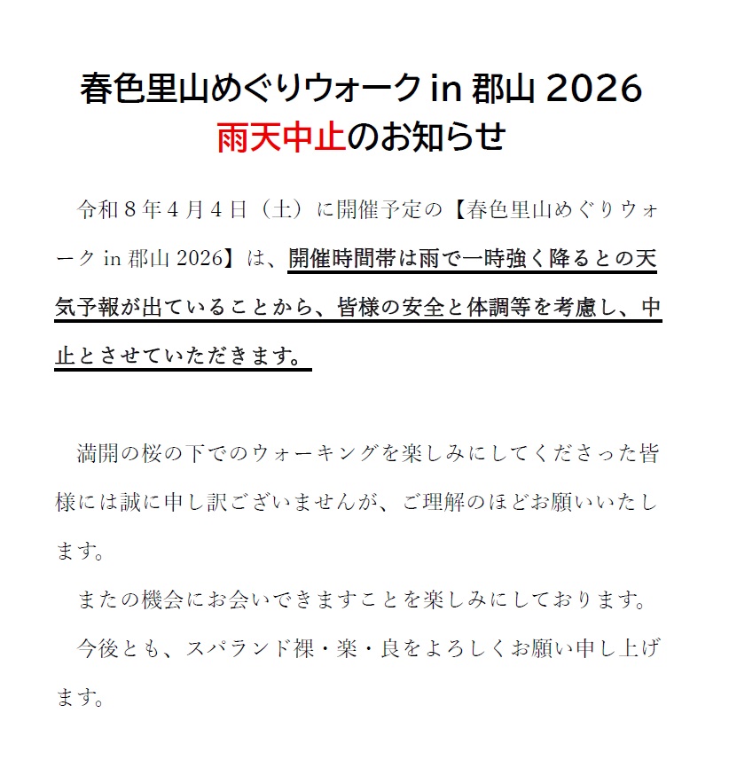 スパランド裸・楽・良 春色里山めぐりウォークin郡山2026 雨天中止のお知らせ 2026年4月3日 最終更新日時 : 2026年4月3日 spa-ra3_staff ※同時開催で予定している野菜市は実施いたします。 ※今回の中止による延期開催はありません。
